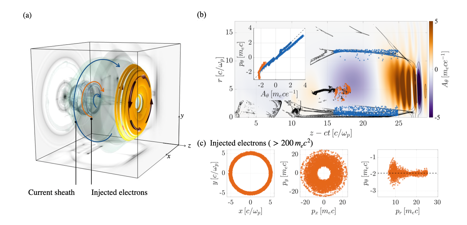 P2-team alumnus Camilla Willim is the first author of this paper. The paper shows, with theory and PIC simulations in Osiris, that azimuthaly polarised lasers can drive a mechanical rotation of the plasma, once laser frequency downshifts become significant during propagation. Because lasers with azimuthal polarisation carry zero angular momentum, we found that the angular momentum carried by the plasma is compensated by the angular momentum carried by the self-consistently generated electric and magnetic fields in plasma. Our results then show that the laser polarisation can be used as a knob to control the motion of mater, at relativistic intensities. This control can benefit applications related to plasma accelerators and light sources. Click here for additional info.
