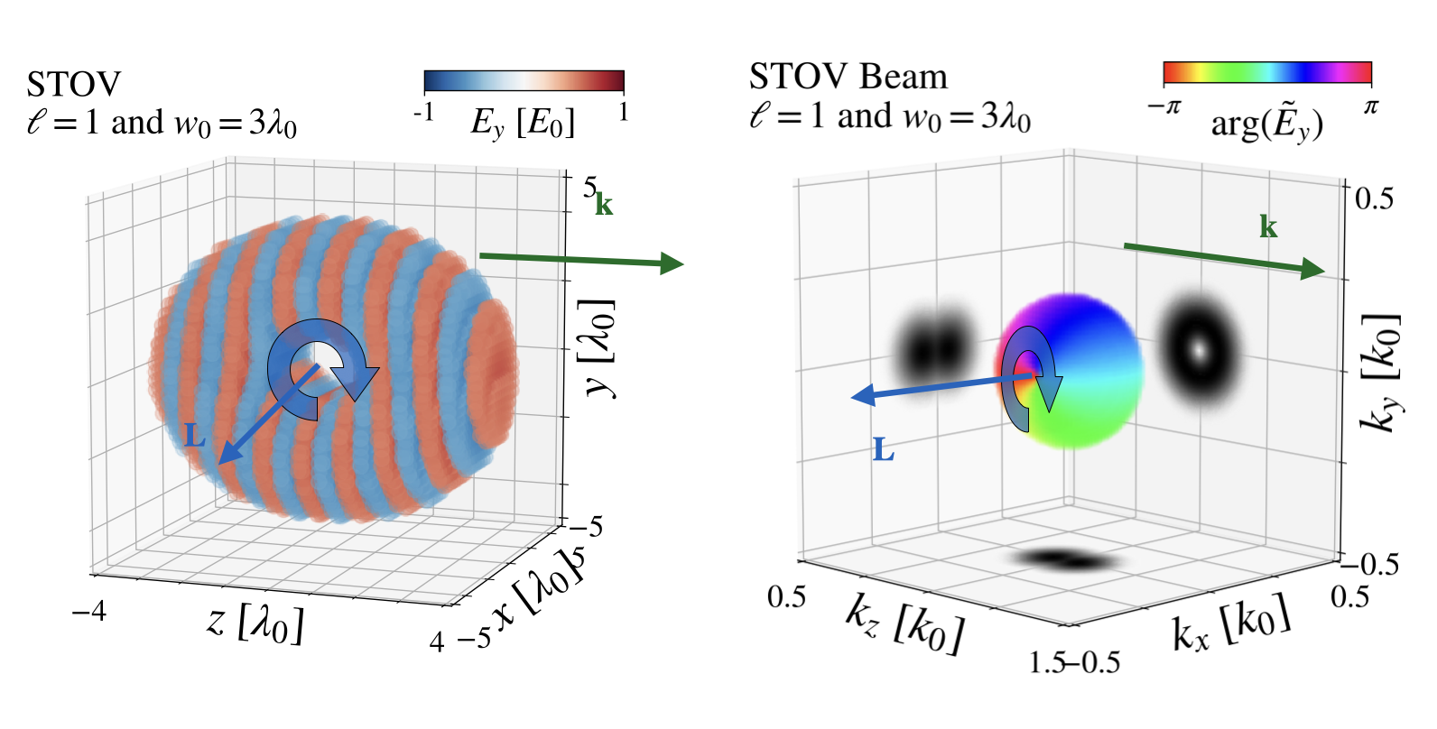Construction of an OAM beam from a minimalistic definition of structured light. (a) Interference of three plane waves with differ- ent k wave vectors and phases leading to a lattice with a vortex phase. (b) Extension to the case of 20 plane waves, resulting in a well-defined donut beam carrying OAM. Taken from our paper here.